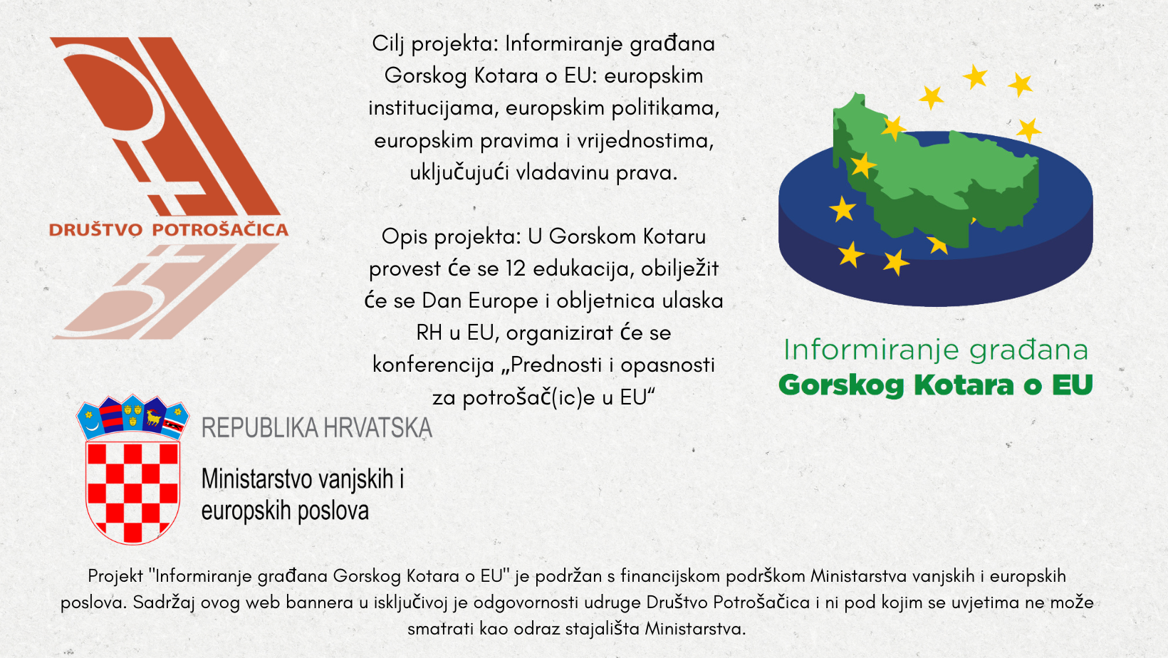Društvo Potrošačica je s današnjim danom, 1. srpnja, završilo s provedbom četveromjesečnog projekta “Informiranje građana Gorskog Kotara o EU“ čiji je cilj bio informiranje građana Gorskog Kotara o EU: europskim institucijama, europskim politikama, europskim pravima i vrijednostima, uključujuću vladavinu prava. Navedeni projekt je sufinanciran kroz Natječaj za prijavu projekata iz područja Informiranja o EU. Ministarstvo vanjskih i europskih poslova sufinancira projekt vrijednosti 10.906,00 € sa 6.796,00 €.
